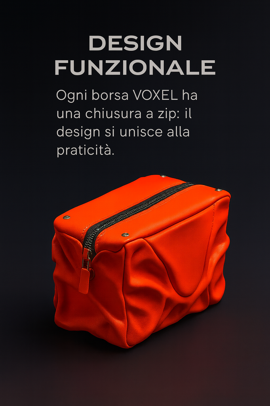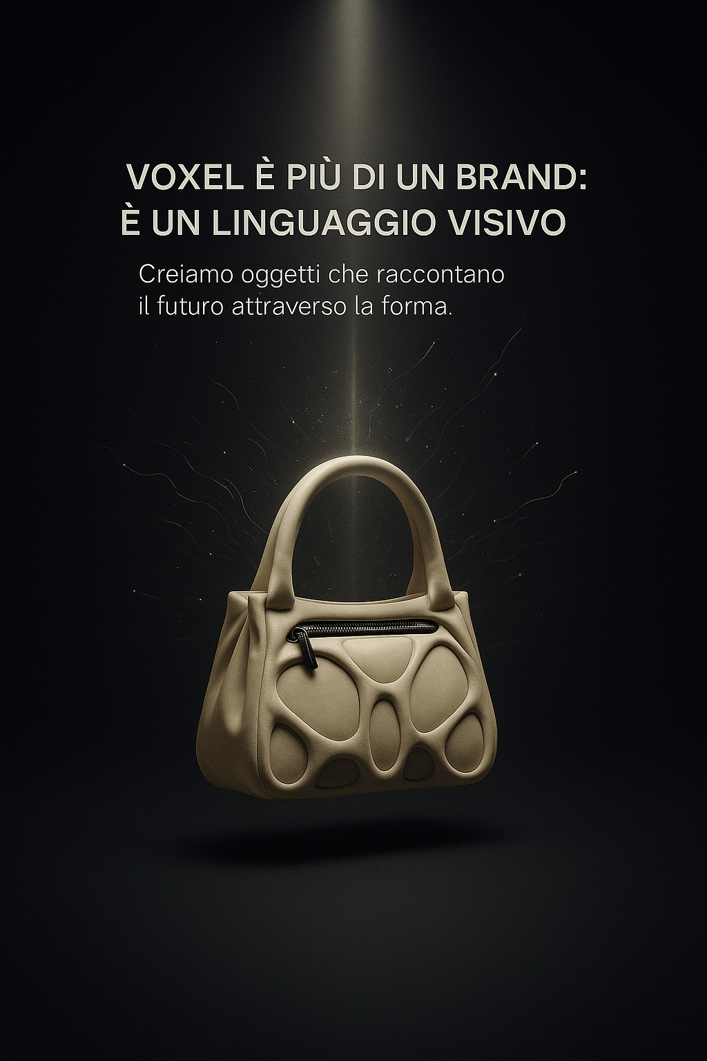 Ogni borsa VOXEL è un pezzo unico: progettata digitalmente, stampata in 3D, rifinita e chiusa a mano.